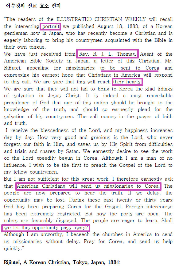 바로 이 조선인 크리스찬 Mr. Rijutei(이수정의 일본 발음)가 쓴 편지를 받았습니다.