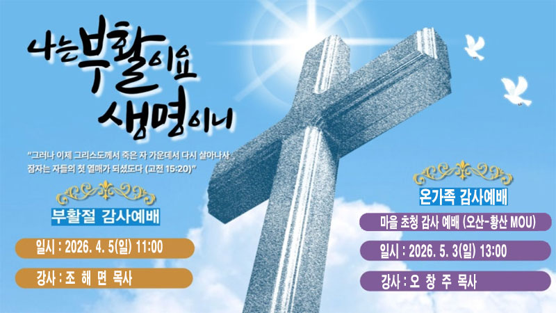 공지 | 부활절 감사예배 페이지 정보 작성자 최고관리자 작성일26-04-04 17:41 조회23회 댓글0건 관련링크 이전글 다음글 목록 글쓰기 본문 * SNS공유 댓글목록 등록된 댓글이 없습니다. 이전글 다음글 목록 글쓰기