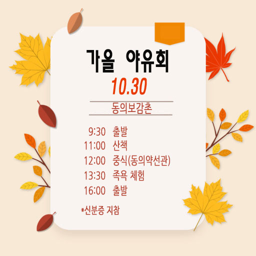공지 | 10.30 가을 야유회 페이지 정보 작성자 최고관리자 작성일25-10-28 10:19 조회205회 댓글0건 관련링크 이전글 다음글 목록 글쓰기 본문 SNS공유 댓글목록 등록된 댓글이 없습니다. 이전글 다음글 목록 글쓰기