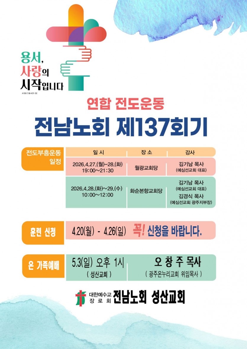 공지 | 온 가족예배 페이지 정보 작성자 최고관리자 작성일26-04-20 11:14 조회76회 댓글0건 관련링크 이전글 다음글 목록 글쓰기 본문 * SNS공유 댓글목록 등록된 댓글이 없습니다. 이전글 다음글 목록 글쓰기